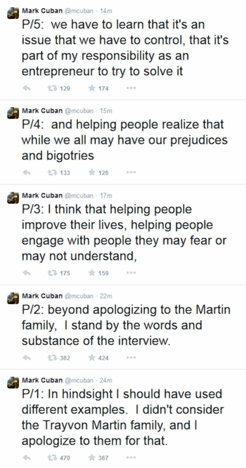Cue the media firestorm!  Owner makes racist remarks!  Less than a day later, Cuban has tweeted out a 5 part tweetpology: