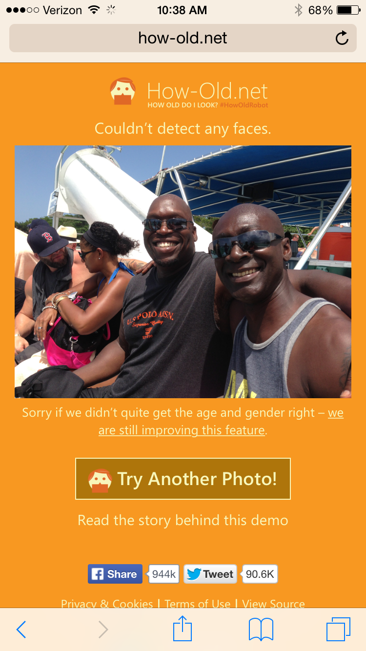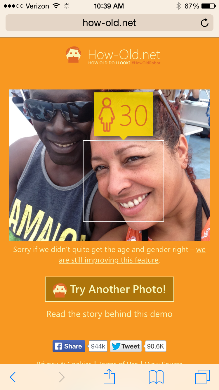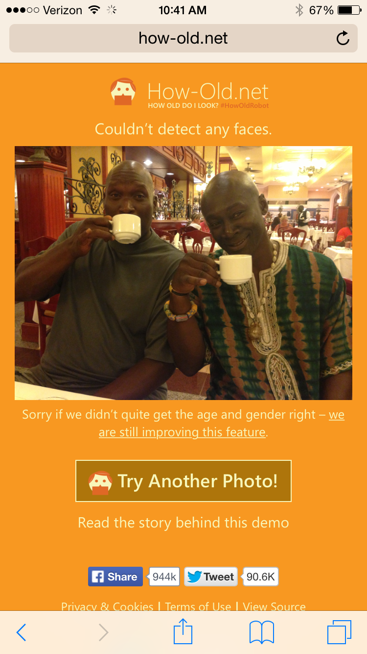 We love to take pictures of ourselves.  We love youth.  So, its only a matter of time that we get an app that looks at our selfies and answers the age old question: do I look old?  How-Old.net is a simple site that allows you to choose a picture and, using facial recognition software, it will guess your age.  While trying to find a picture that would tell me I looked young, I found something interesting.  The site told me I was not-so-old (great!) but at least it could see me–my Ghanian husband: not so much.