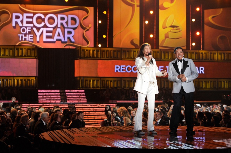 Steven Tyler belts out a few bars of Smokey Robinson’s   You Really Got a Hold On Me as Smokey looks on.  Maybe it’s that smooth skin you could bounce a quarter off, but Smokey looks less than impressed.